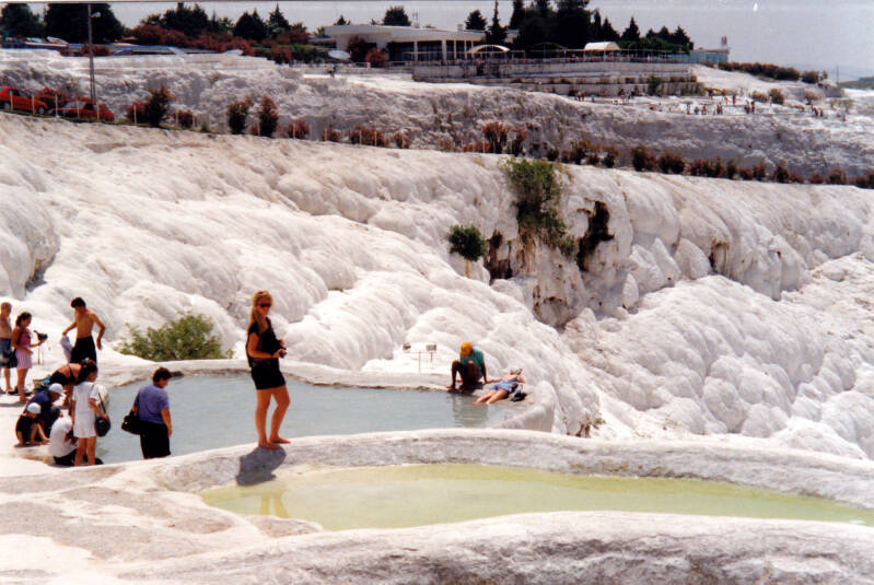 Uit het warme water slaat calciumcarbonaat neer en zo worden dikke pakketten kalk langs de terrassen afgezet. Op deze manier krijgt de helling een bijzonder uitzicht: het lijkt op een op kasteel van katoen of op een bevroren waterval. Gegeten en tot 15.30 uur gezwommen, echt lekker! We zitten onder de kalk dus natuurlijk glijd handige Harry weer uit... knie open! Tegenwoordig wordt het publiek geweerd van de kalksteenterrassen omdat er teveel beschadigingen werden veroorzaakt. Om 15.30 uur vertrekken we en om ongeveer 19.30 uur zijn we weer in ons appartement.