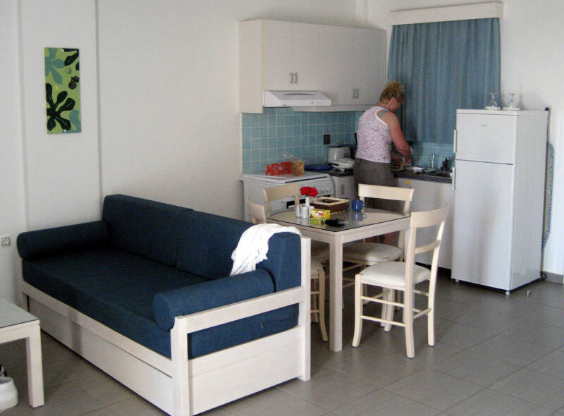 Almyra Village ligt in Pigadia, de hoofdstad van Karpathos, 16 kilometer van de luchthaven en ongeveer één kilometer lopen vanaf het centrum. We hebben een prachtige studio op de begane grond en kijken over het zwembad heen naar de zee. Alles is aanwezig, koffiezetter, waterkoker, tosti-ijzer, broodrooster, sinaasappelpers enz. Er ligt een boodschappenlijstje klaar waar je op aan kunt geven wat je graag wilt hebben en dan gaat George, de eigenaar, dat voor je halen. Ook kun je een fiets (met mandje) pakken om boodschappen mee te gaan doen. Op zich best handig want de grotere supermarkten liggen in het centrum en dat is niet ver lopen maar wel tegen een enigszins hellende berg!