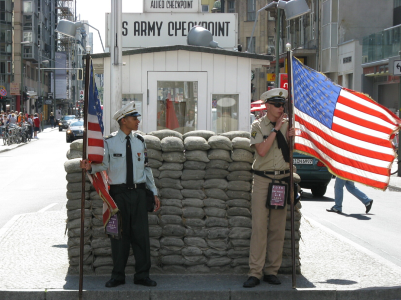 Na een kopje koffie/thee en een heerlijke apfelstrudel voor Henk en Yoerin komen we aan bij de Brandenburger Tor. Dit is het bekendste symbool van Berlijn, in het centrum van de Pariser Platz. Via de Potsdamer Platz (het bruisende hart van Berlijn met vele imposante gebouwen) moeten we als echte toeristen natuurlijk ook langs Checkpoint Charlie. Dit was tijdens de verdeling van Berlijn een controlepost op de grens van de Amerikaanse en Russische sector, bij een doorgang in de Berlijnse Muur in de Friedrichstrasse. Er staat nu alleen nog een replica van het wachthuisje.