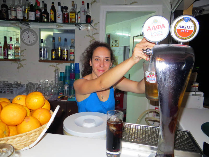 Bij de bar bij het zwembad kun je echt heerlijk zitten en er staat genoeg op de lunchkaart om elke dag iets anders te nuttigen. We hebben er 's avonds ook een keer gegeten en dat was ook prima! Heel gezellig om na het eten nog even aan de bar te hangen! Christos, zijn vrouw Evanthia (Effie) en zijn zus Lila zijn echt ontzettend leuke en lieve mensen. Wat dat betreft is er echt geen woord gelogen van alle reacties op Zoover! Wat werken die mensen hard... vooral voor Effie heb ik een zwak... wat een grappig mens! Bij het zwembad staan genoeg bedjes dus handdoekje leggen is echt niet nodig. Zeer beschamend dat twee bejaarde Nederlanders dat elke dag als enige doen... Overigens was er alleen wifi bij het zwembad of bij de receptie.