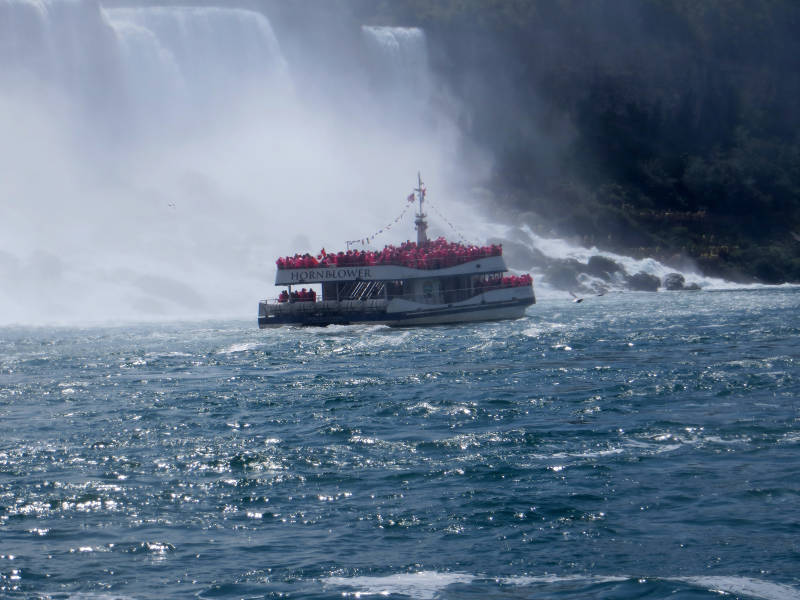 We zijn met 22 man uit verschillende landen, erg leuk. Als iedereen opgehaald is beginnen we meteen met het hoogtepunt: de cruise met de Hornblower langs de watervallen. We krijgen een poncho en Yoerin en ik hebben de mazzel dat we als eerste de boot op mogen en kunnen dus een plekje op de boeg kiezen. Fan-tas-tisch!! We worden zeik- en zeiknat maar WAUW wat is dit vreselijk mooi! Ze zijn vanaf een afstandje al indrukwekkend, maar zo dichtbij is het echt adembenemend! Wel goed uitkijken dat je fototoestel niet nat wordt!