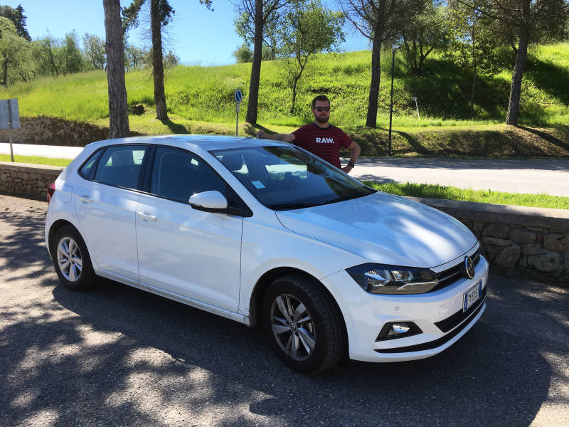 De taxi haalt ons om 09.00 uur op en om 09.30 uur zijn we al op Schiphol. Alles gaat vrij soepel dit keer, boekie gekocht, broodje gegeten en we vliegen op tijd met Transavia om 12.20 uur. Aankomst Pisa om 14.15 uur. Ook de koffers zijn er gelukkig vrij snel. In een plenzende regen in de rij gaan staan voor de transferbus naar de huurauto. Wij moeten naar Locauto (onderdeel van Sunny Cars) en na het invullen van de benodigde formulieren krijgen we de sleutel van een prachtig witte Volkswagen Polo. Hij ruikt nog helemaal nieuw en dat klopt ook wel want hij blijkt van januari 2018 te zijn! De navigatie aangezet en op weg naar Villa Cheli. Het is ongeveer een half uurtje rijden.