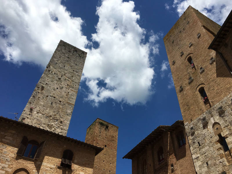 De torens waar San Gimignano zo bekend om staat zijn zo goed als allemaal gebouwd tussen de twaalfde en veertiende eeuw. Het waren de adellijke families van het stadje die de torens lieten bouwen om hun fortuin te tonen aan de rest van de stad. De veertien torens die tegenwoordig nog in het dorp staan zijn slechts een schim van hoe het dorp er in de veertiende eeuw moet hebben uitgezien. Volgens sommige bronnen stonden er indertijd 72 torens in San Gimignano. Het dorp is zo klein dat de torens de skyline flink domineren. Daarom wordt het ook wel het 'Manhattan van de Middeleeuwen' genoemd.