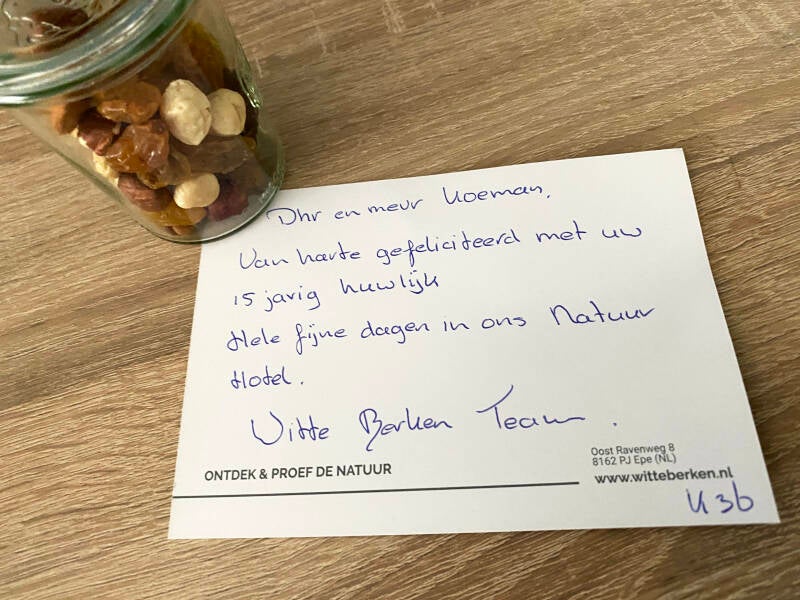 We rijden door naar Epe, vanaf hier nog zo’n 20 minuten met de auto. Rond 14.00 uur arriveren we in Witte Berken Natuurhotel. Dit hotel grenst direct aan het Landgoed Tongeren en ligt aan de rand van Epe, midden in het bos. We hebben het 3-Daags Witte Berken Arrangement geboekt met overnachting in een Welsh kamer en 2x een driegangen keuzemenu. De kamer is helaas nog niet klaar dus we besluiten alvast even een verkenningsrondje te maken door het bos. De omgeving is echt prachtig. Om 15.00 uur is de kamer klaar, we hebben kamer 36.