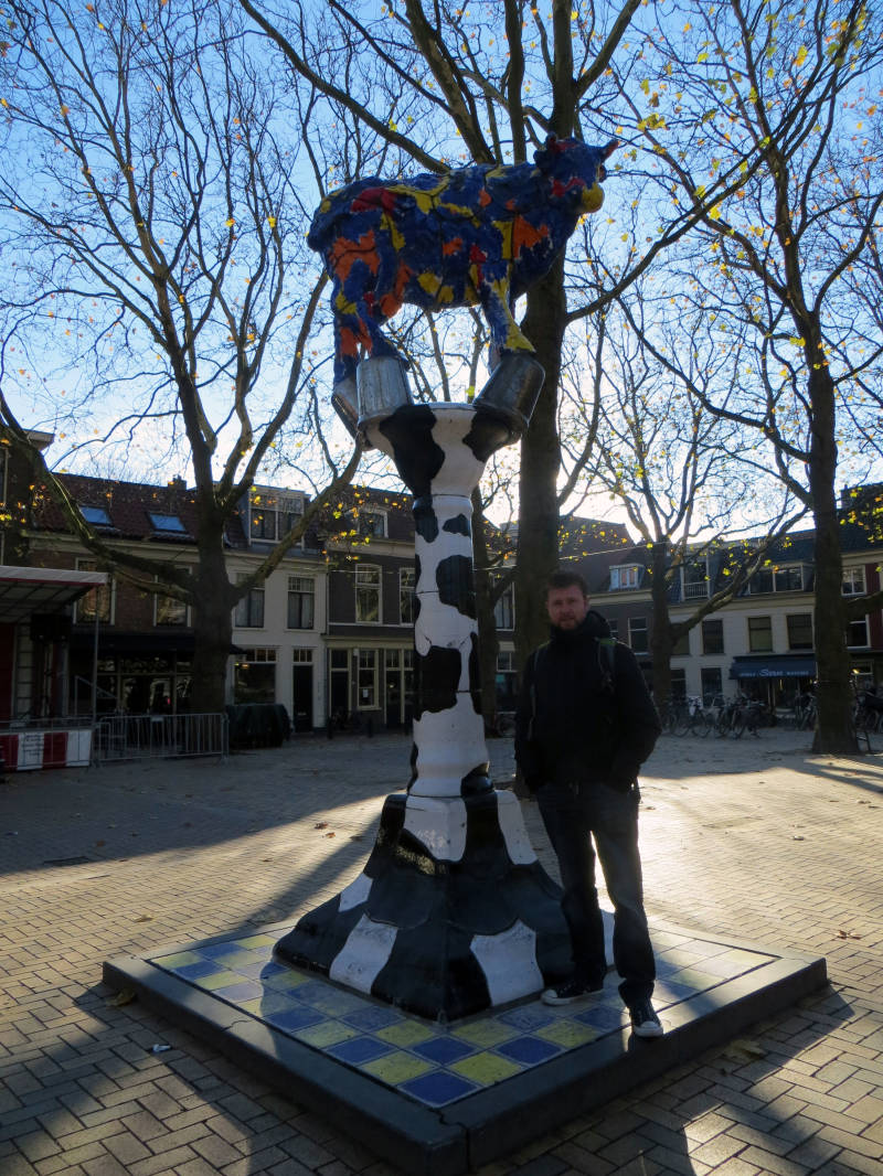 We lopen verder en komen langs het huis waar Johannes Vermeer minstens 15 jaar woonde en werkte. Daarna komen we uit op de Beestenmarkt. Op dit moment is het er loeidruk en staat er een groot podium in afwachting van Sinterklaas! Vroeger werd hier (verrassenderwijs) de Beestenmarkt gehouden. Er staan nog enkele paaltjes waar vroeger de schotten voor de beesten tussen geplaatst werden. Er staat een groot standbeeld in het midden van een koe. We wringen ons tussen de mensen door en vervolgen onze route. We zien talloze hofjes, huisjes met prachtige geveltjes, grachten en de enige overgebleven stadspoort (Oostpoort).
