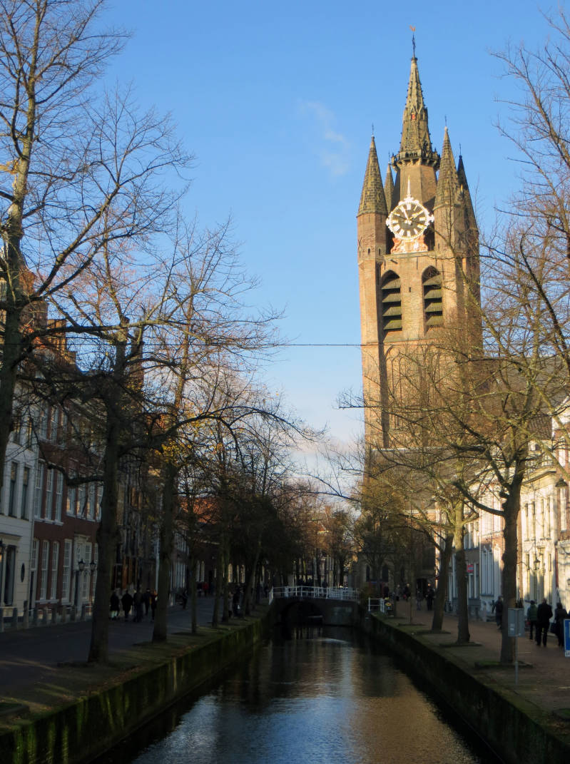 De Oude Kerk ligt er bijna pal tegenover dus we besluiten die ook met een bezoekje te vereren. De kerk wordt ook wel de Delftse Toren van Pisa genoemd want hij staat bijna twee meter uit het lood. Hier zijn meer dan 1400 familiegraven, waarbij zo'n graf wel zes kisten kon bevatten. Bekende mensen die hier begraven liggen zijn onder meer Johannes Vermeer, Antoni van Leeuwenhoek en de zeehelden Piet Hein en Maarten Tromp (onze derde zeeheld Michiel de Ruyter ligt begraven in de Nieuwe Kerk in Amsterdam). Johannes Vermeer sterft als armoedzaaier. Toch mag hij hier begraven worden, in het familiegraf van zijn schoonmoeder waarin al drie van zijn jonggestorven kinderen lagen. Zijn weduwe bleef achter met grote financiële problemen en elf kinderen waarvan er tien nog minderjarig waren. Pas na zijn dood krijgt Vermeer de erkenning die hij verdient. Veel grafstenen zijn beschadigd. In de Franse tijd (rond 1800) gaat men voor vrijheid, gelijkheid en broederschap en is men wars van standsverschil. Van alle grafmonumenten worden de wapentekens, vlaggen en andere symbolen van stand verwijderd. Sommige grafstenen blijven echter bewaard in authentieke staat doordat men ze tijdelijk omkeert.