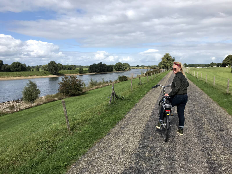Terug naar het hotel en daar voor €19 per persoon een elektrische fiets gehuurd. Wel een beetje gedoe want je krijgt een sleuteltje waarmee je zelf in de schuur op zoek moet naar je fiets en bijbehorende oplader. Hadden we 'm eindelijk gevonden, was de band leeg! We willen naar hanzestad Doesburg fietsen, zo'n 10km verderop en hopen maar dat het droog blijft! Je fietst hier heerlijk langs de IJssel, de omgeving is echt prachtig en op bepaalde stukken kom je gewoon heel lang niemand tegen.