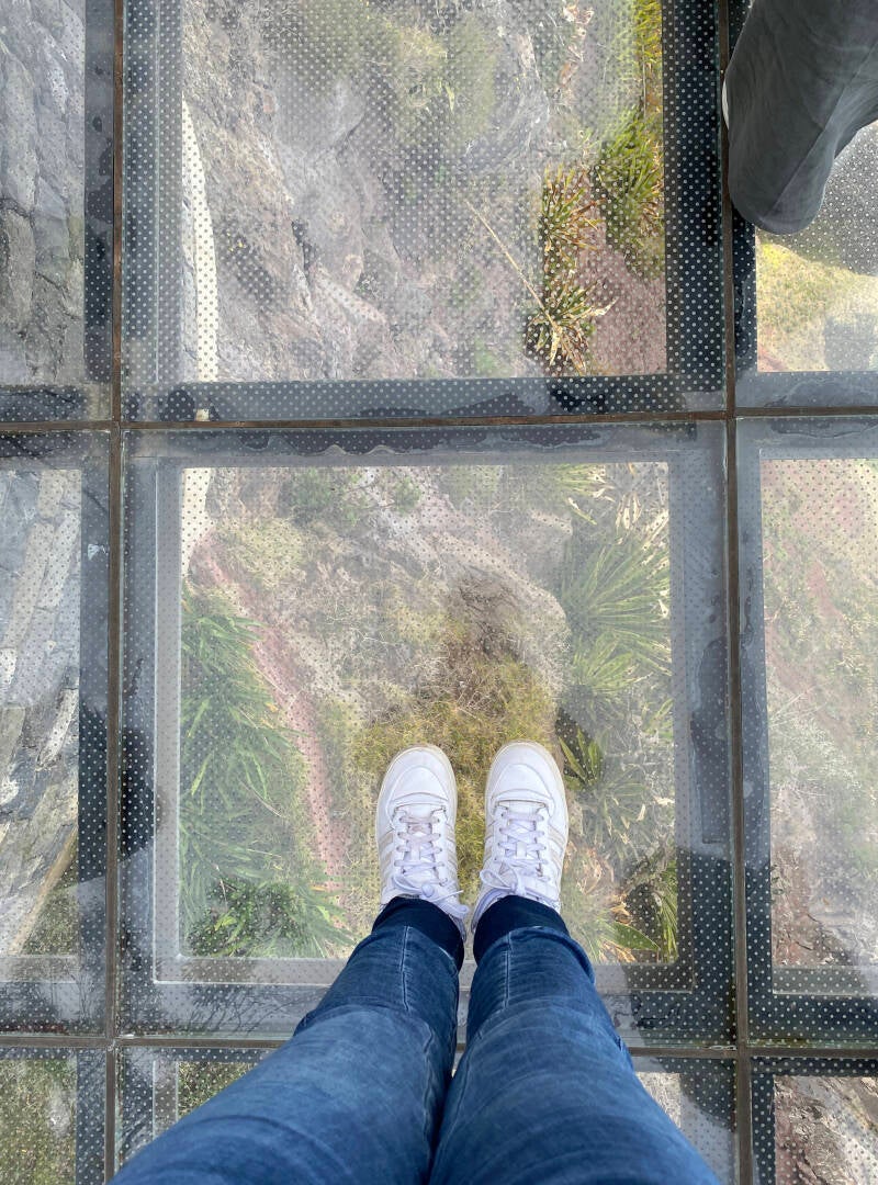 Laatste keer ontbijt, dit keer met scrambled eggs. Koffertje ingepakt, uitgecheckt en rond half 10.30 uur op pad. We rijden eerst in zo’n 20 minuten naar de 580 meter hoge Cabo Girão Skywalk. Mega druk hier, we moeten de auto gewoon ergens aan de kant, half op de weg zetten. Nouja, moet maar even snel. De Cabo Girão Skywalk is een glazen loopbrug en steekt over de rand van een 580 meter hoge klif. Je kijkt hier heerlijk de diepte in. Niet te doen als je last van hoogtevrees hebt dus Yoerin blijft lekker op de kant staan! Vanaf hier heb je een spectaculair uitzicht op de wijde omgeving. De entree is €2.