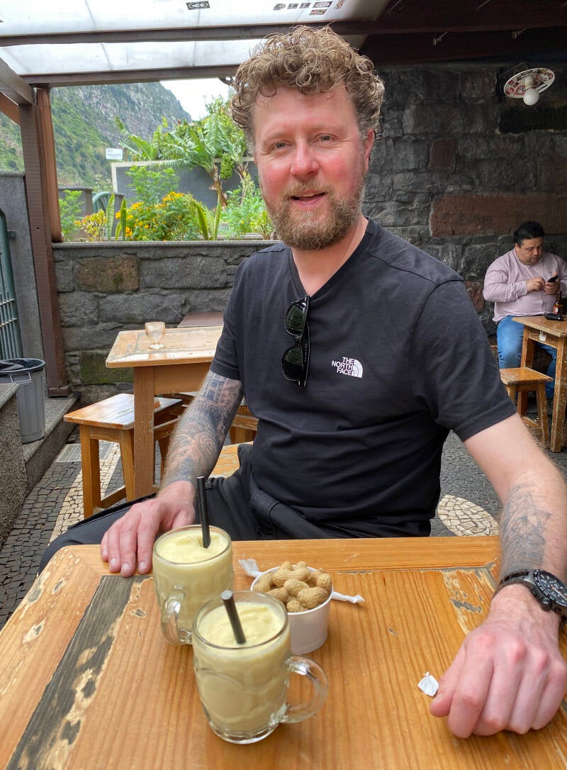 Daarna rijden we door naar de baai Fajã dos Padres, ingesloten tussen een enorme rotswand en de oceaan. Het is de bedoeling om hier met de kabelbaan naar beneden te gaan voor een prachtig uitzicht maar het is wederom vreselijk druk en we kunnen de auto hier met geen mogelijkheid kwijt. Yoerin is er klaar mee dus we gaan op weg naar ons eindpunt van vandaag: São Vicente. Het is maar een half uur rijden en onderweg stoppen we even bij Taberna Poncha naar we dachten voor een koffie maar dat verkopen ze niet. Naast de traditionele Poncha, een sterk alcoholisch drankje in verschillende variaties maar allen met rum, hebben ze maar 1 drankje zonder alcohol, de Nikita bestaande uit passiefruit met ananas ijs. Overigens is er ook een Nikita met alcohol bestaande uit bier met ananas ijs. Hmmmm….. Die zonder alcohol is in elk geval zeer smakelijk en het is ook een erg leuk tentje!
