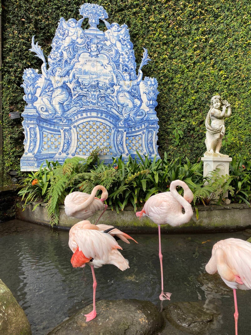 Eenmaal boven aangekomen lopen we naar Monte Palace Tropical Gardens, de mooiste tuinen van Madeira (vanuit de kabelbaan sta je zo voor de ingang). Een kaartje kost €15 p.p. en het is echt prachtig! Het is maar liefst 70 km2 groot en staat vol met zowel inheemse bloemen en planten als exotische soorten. Daarnaast zie je ook veel bruggetjes, poortjes en versieringen in Japanse/Chinese stijl. We besluiten bij een kraampje een lekker ananasdrankje te bestellen, ziet er echt heerlijk uit en dat mag ook wel want deze kost €15, gewoon net zoveel als de entree! Je kunt hier uren rondlopen maar dat gaan we niet doen, er is behoorlijk wat hoogteverschil dus het is best vermoeiend! Ik kan hier wel 100 foto's van plaatsen maar ik zal het bij vier houden ๐