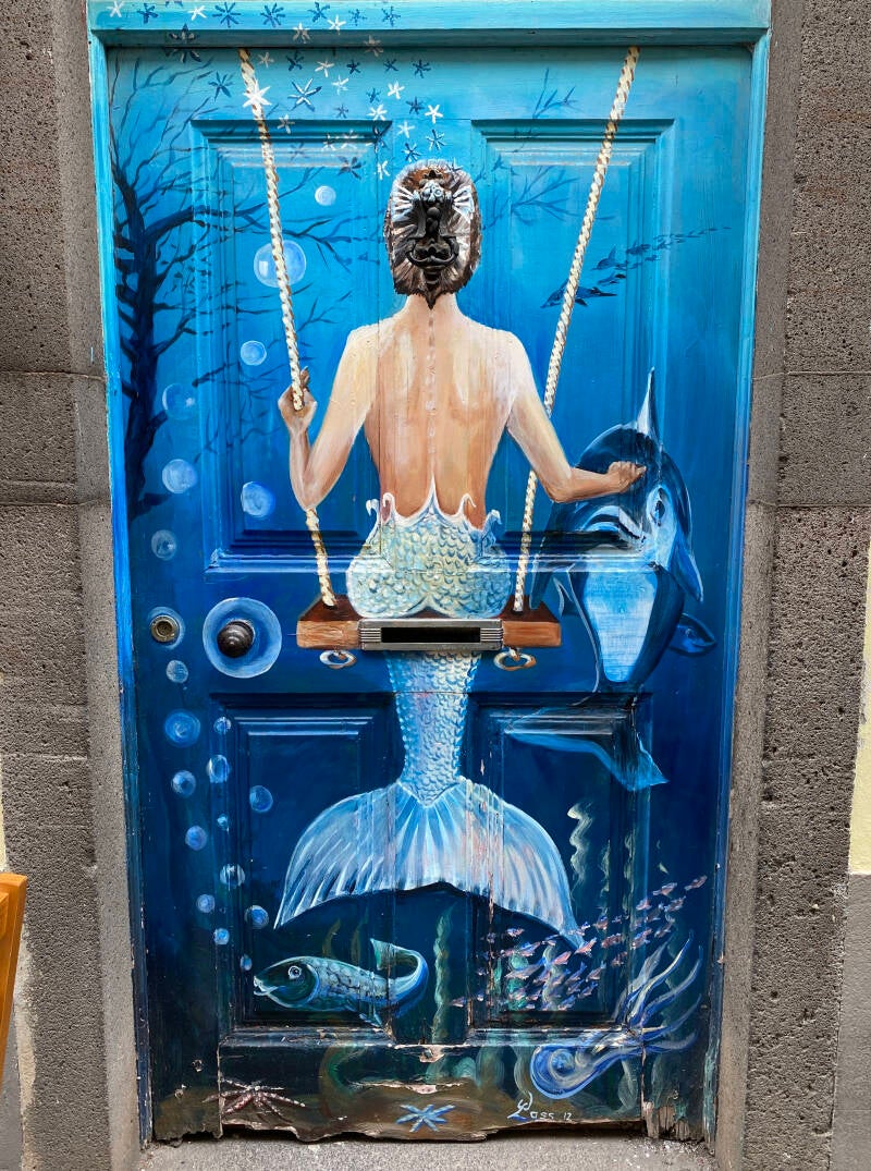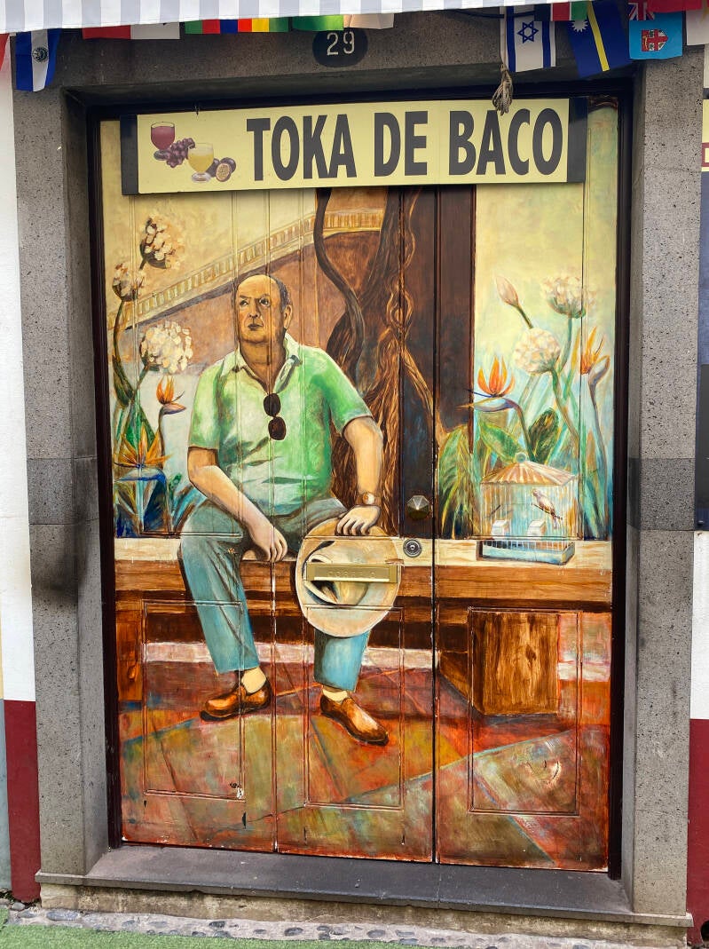 Een kaartje kost €20 p.p. en is 48 uur geldig. Er zijn 19 stops inclusief uitkijkpunt Pico dos Barcelos en Camera de Lobos. Lekker het hele rondje blijven zitten. Toen we weggingen was het warm en zonnig maar nu is het behoorlijk bewolkt. Tegen 12.00 uur uitgestapt. Een rondje gelopen, het is duidelijk zondag want niet alles is open. Bij toeval komen we terecht in de wijk Zona Velha, het oude stadsdeel van Funchal. Deze wijk was ooit vervallen en totaal niet in trek bij toeristen totdat een groep kunstenaars de boel heeft opgeknapt. In de straat Calle de Santa Maria is iedere deur beschilderd met kleurrijke tekeningen.