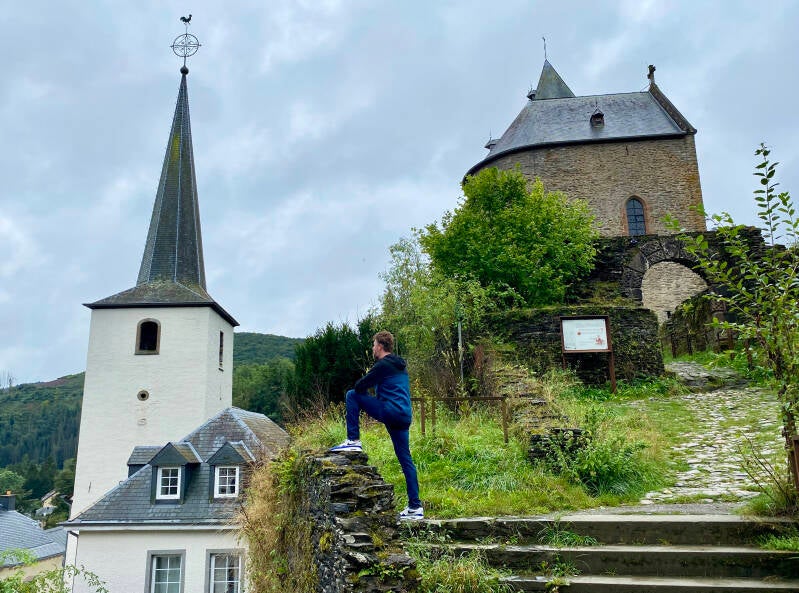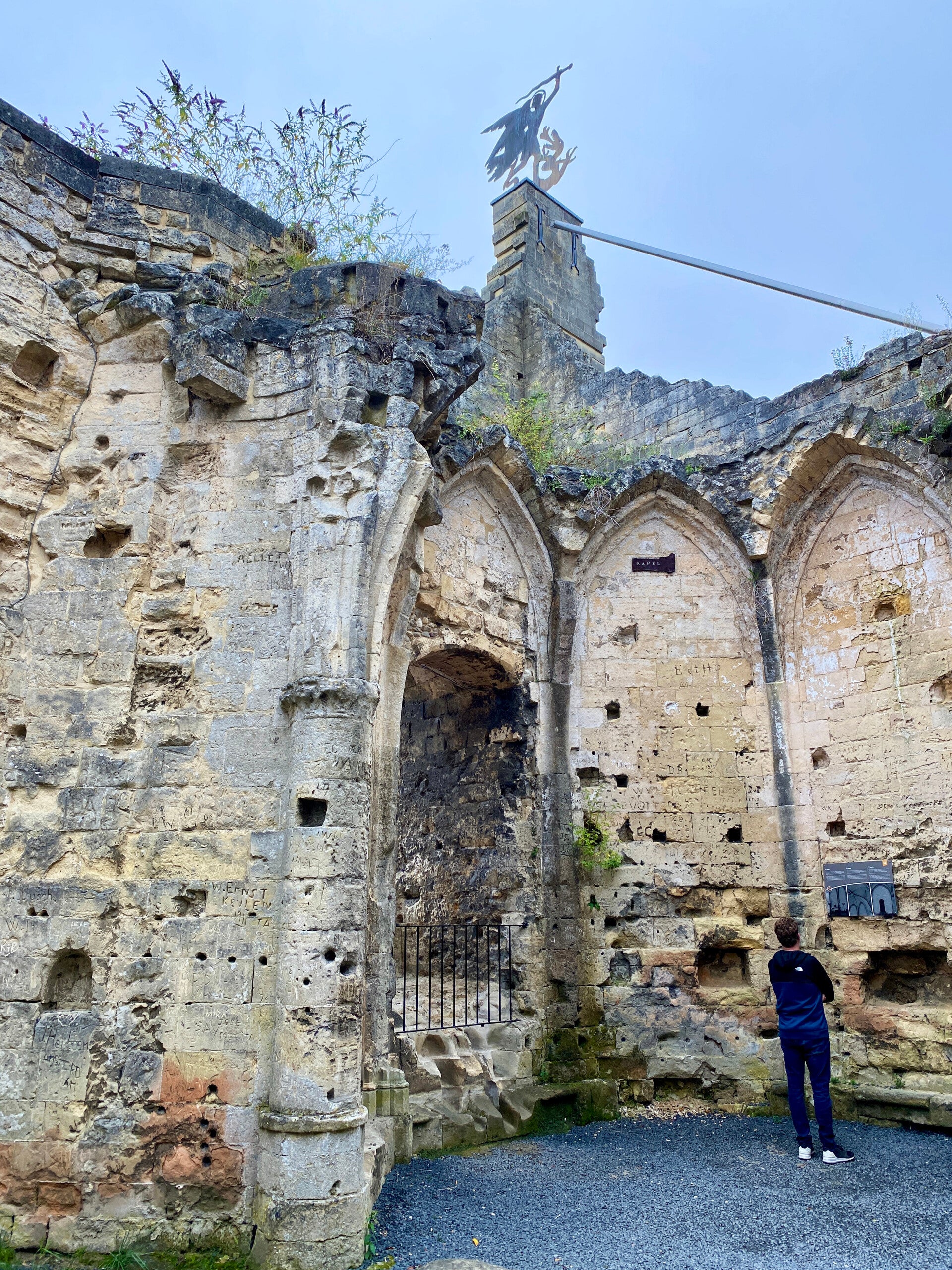Dit komt onder meer door zijn prachtige ligging aan de rivier Sauer. Even naar de kasteelruïne geklauterd, beetje tricky op ongelijke natte keien en nou ook weer niet heel erg de moeite waard… Daarnaast is het flink bewolkt dus we besluiten al snel om verder te rijden naar Dinant, zo’n anderhalf uur vanaf hier.