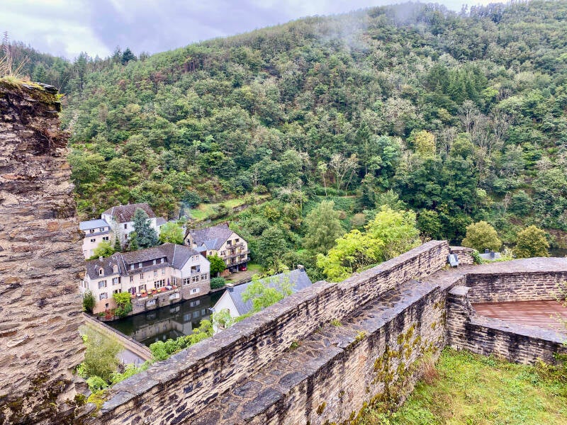 Laatste keer ontbijt (en wit brood hoop ik). Maar geen kwaad woord over dit leuke familiehotel met super aardige mensen en zelfs een eigen soort van krantje, de ‘Heintz Times’ met allemaal leuke weetjes over het hotel en bezienswaardigheden in de omgeving. Er staat ook een woordje Luxemburgs in, erg grappig en het lijkt soms best op Nederlands. 'Hoe gaat het' is bijvoorbeeld 'Wéi geet et'. Ons koffertje weer ingepakt, uitgecheckt en rond 10.15 uur zitten we weer in de auto. Tegen elven komen we aan in Esch-sur-Sûre, een schilderachtig dorpje verscholen in de heuvels. Het is een klein dorpje maar wordt beschouwd als een van de mooiste van het land.