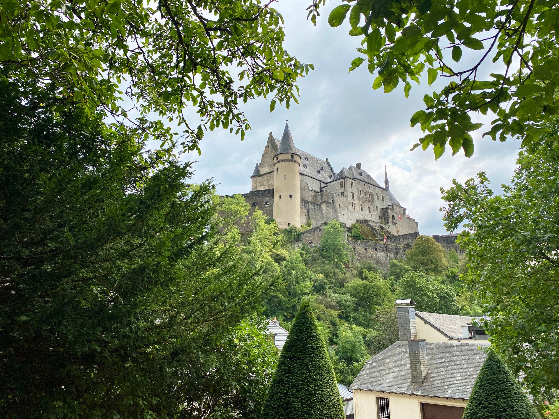 Vanaf hier is het nog ongeveer een half uur rijden naar Vianden en we komen zo rond 13.30 uur aan in Hotel Heintz. Er zijn een aantal parkeerplaatsen achter het hotel maar deze hadden van te voren moeten worden gereserveerd en zijn nu allemaal bezet. Gelukkig is er nog een plekje aan de zijkant van het hotel en kunnen we ‘m daar gratis neer zetten. Kamer 39 op drie hoog is al klaar, op het laatste moment hebben we ‘m aangepast naar een kamer met balkon maar je kunt daar nu echt niet zitten. De zon staat er vol op dus je schroeit daar weg! Het is op de kamer ook lekker heet dus snel wegwezen hier 😊